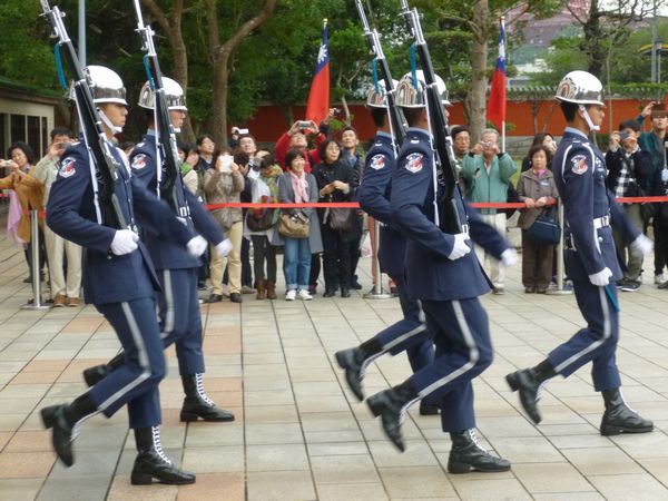 日本統治時代は台湾護国神社が当地に建立されていたが、その跡地に1969年に台北忠烈祠は創建された。大門をくぐると中央広場があり、その奥に中国の宮殿様式の大殿があり、左右の文烈士祠、武烈士祠がある。見どころはたくさんあるが、ツアーで回る観光客の目当ては、1時間ごとに行われる衛兵交代だ。セレモニーの所要時間は約20分間。残りの40分間はまるで蝋人形のように微動だにしない。瞬きもしないといわれている。